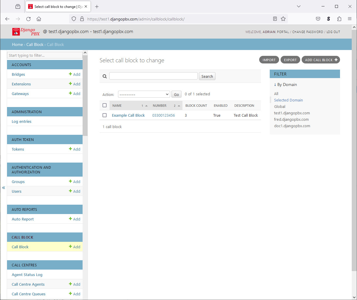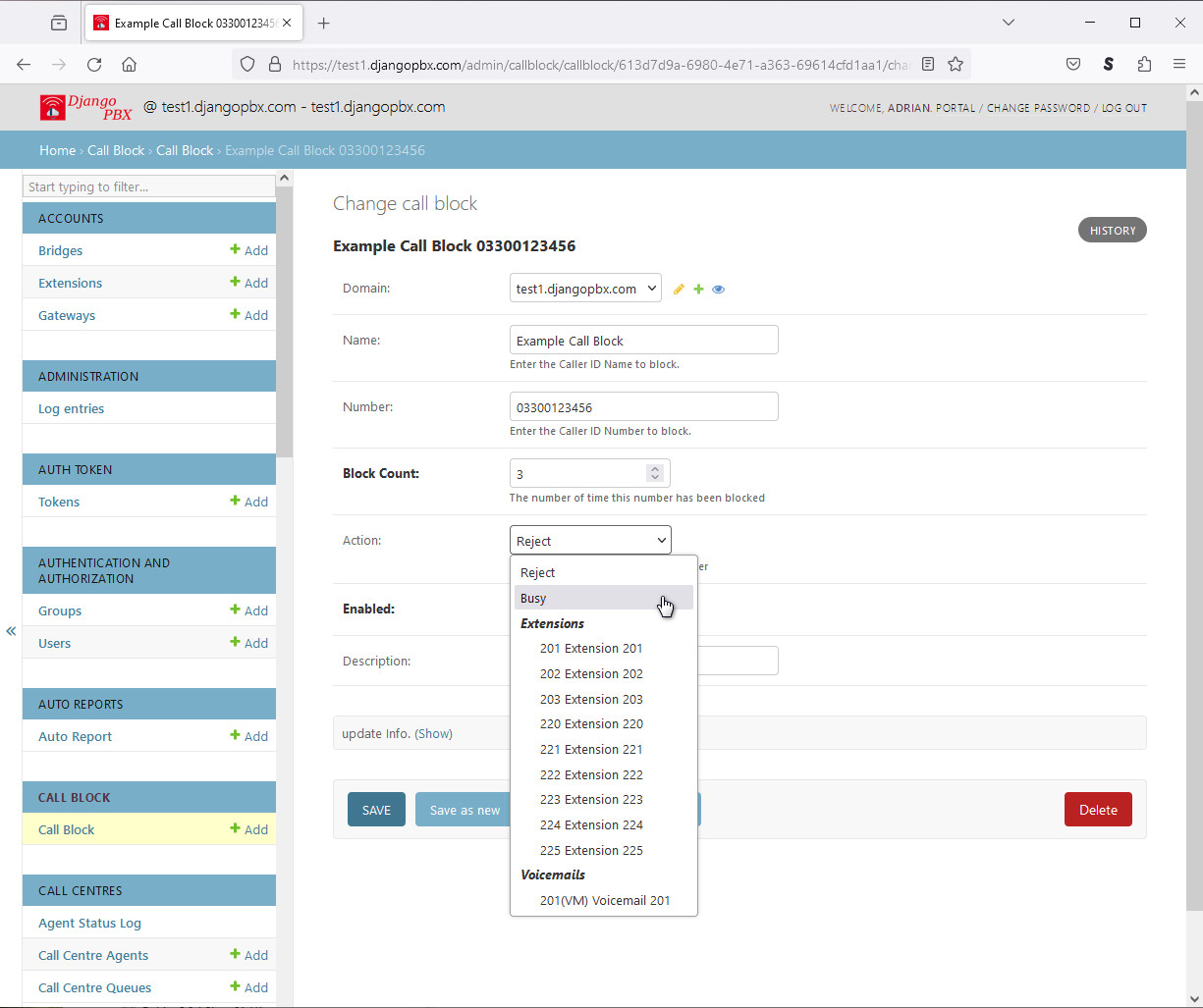 The Call Block application allows inbound calls to be filtered or rejected based on their Caller ID Number or Caller ID Name