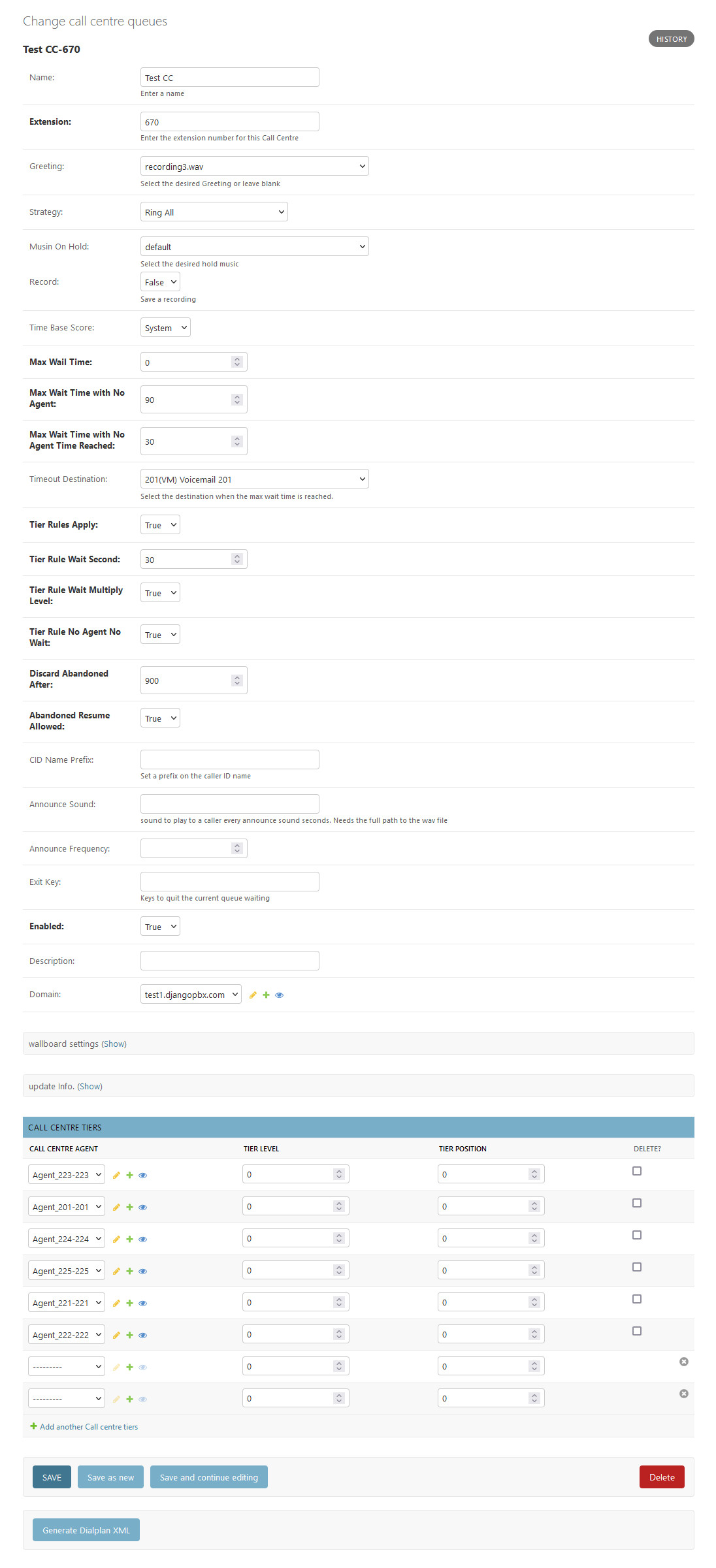 There is also a Call Centre Tiers section that allows Agents to be assigned to the Queue with Tier levels and positions.