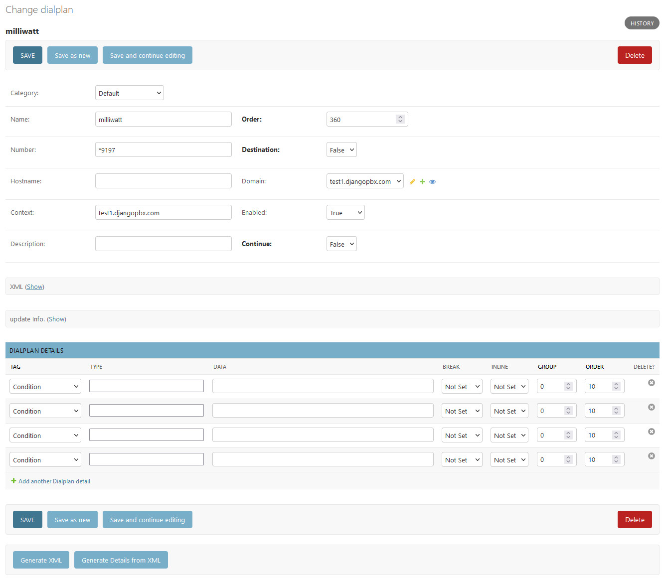 Dialplan editing is largely the same as editing any other record within the Admin Interface. The main difference is the extra buttons available at the bottom of the Dialplan edit form. These buttons are labelled Generate XML and Generate Details from XML.