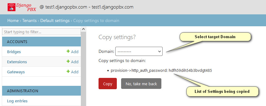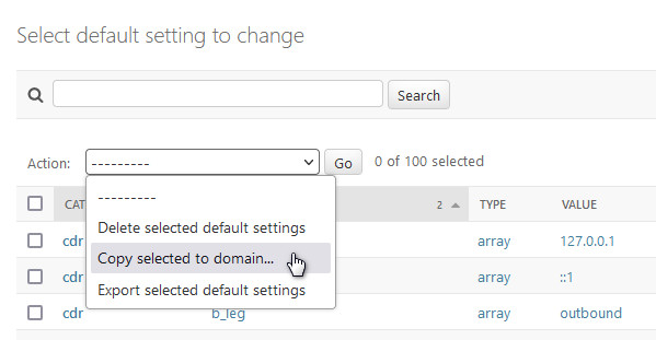 This presents an intermediate screen (shown first below) that allows the selection of the target domain. The purpose of this is to make it easy to create Domain Settings that override Default Settings.