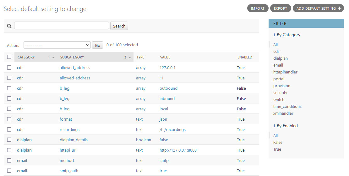 Default Settings are simply an extensible list of values that can be used to control how various aspects of DjangoPBX system operate.