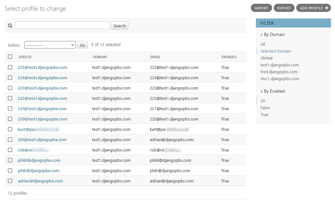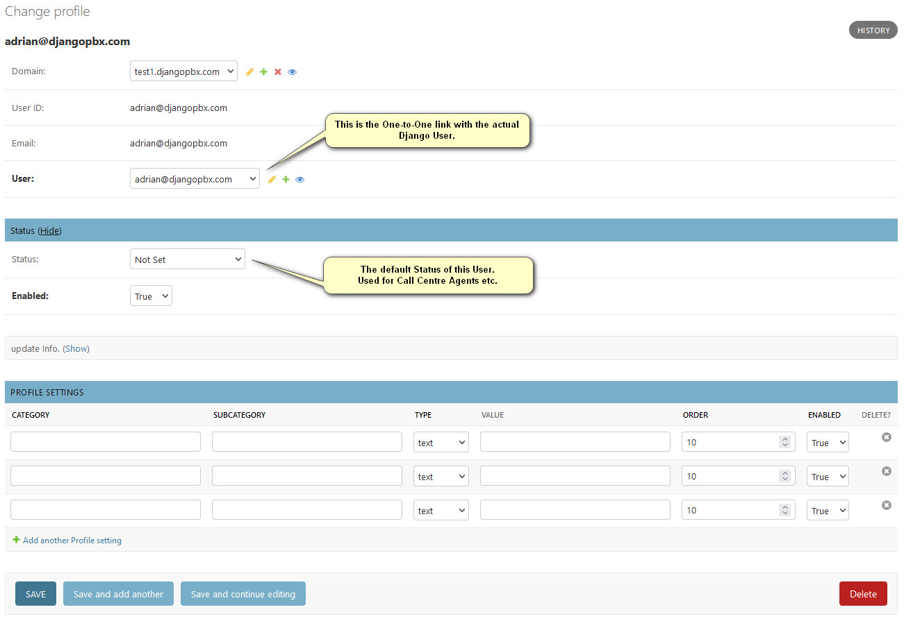 The purpose of the Profile is to augment the auth_user data with PBX-specific items such as the relationship to a Domain and to link with any specific settings applied at the Profile level.