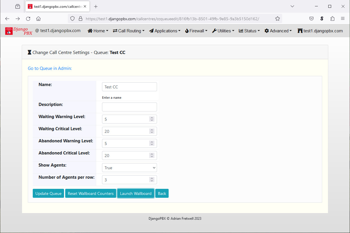Click on the Queue Name to edit the Queue settings or launch the Queue Wallboard