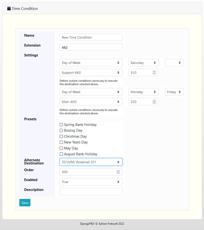 This creates a new Time Condition dialplan record. A Time Condition will allow the system to dynamically route calls based on the time of day and/or the day of the week and/or the day of the month/year. Time Conditions can also use preset values definded in the Default Settings to match a specific date and time like New Year’s Day.