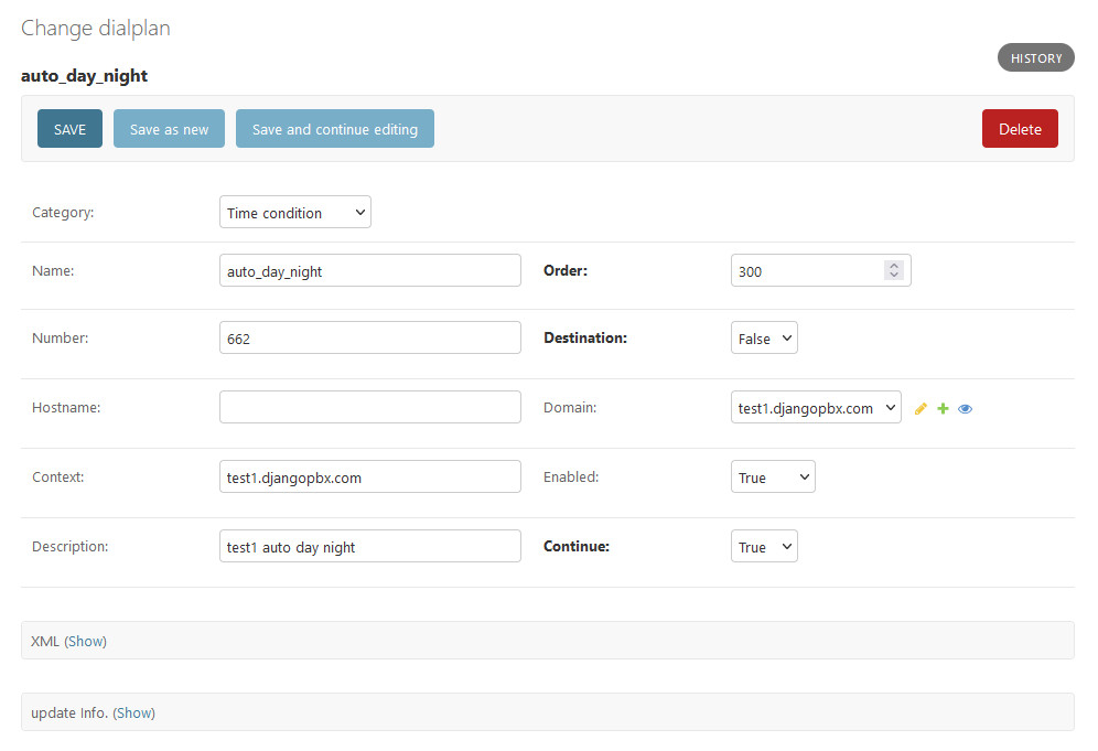 The screenshot below shows a dialplan record created from details entered similar to the edit screenshot above: